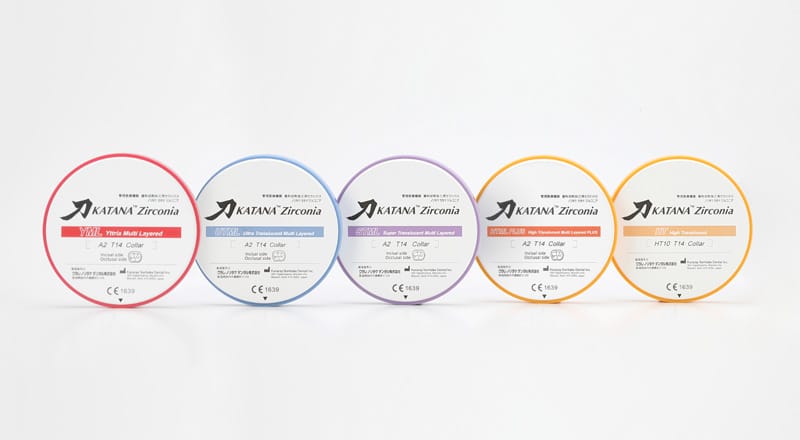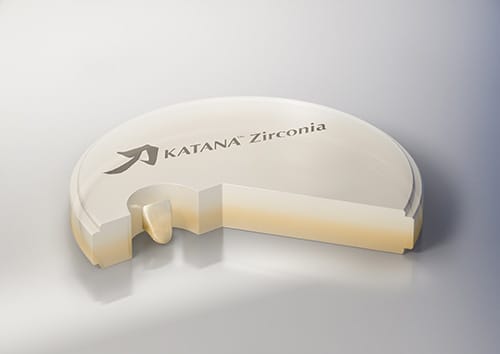 This is a multi-layered zirconia made by layering zirconia of different colors using Katana. It has a smooth gradation with few tone gaps from the enamel layer to the body layer. Six types with different translucency and strength and up to 18 colors are available to meet a variety of applications.