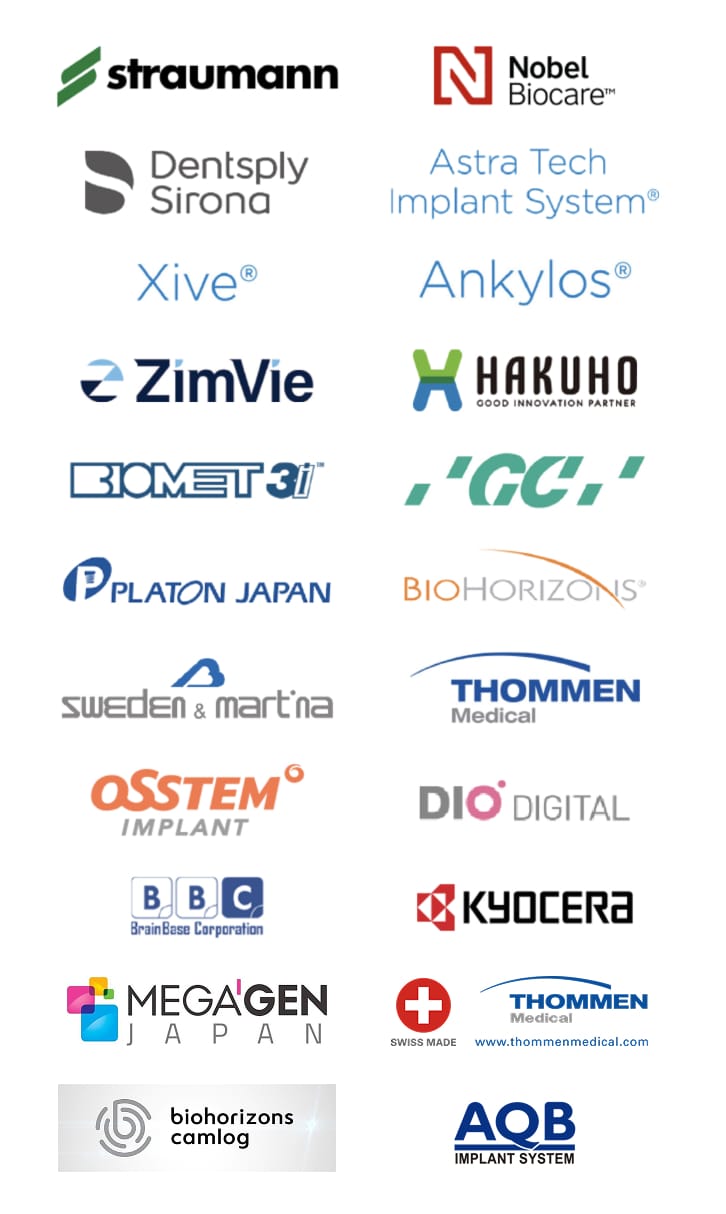 取り扱っているインプラントメーカーは以下の通りです。歴史あるメーカーを始め幅広く取り揃えていますので、ご要望に合わせ柔軟に対応できます。お気軽にご相談ください。
